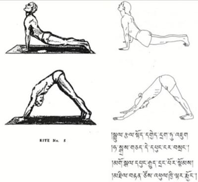 Please, translate the inscription from Tibetan under my picture. Have you any materials about the origins of the Five Tibet Rites or the relations with Tibetan Yantra Yoga? What book you recommends in practice?